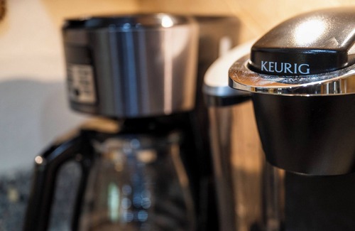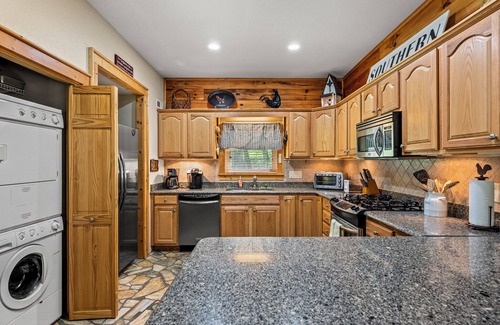 The main living space of the home is located on the second floor along with a spacious and well-equipped deck. This deck is the perfect spot to enjoy the surrounding scenery while grilling, with a picnic table, a gas grill, and a wooden porch swing. Back inside, gather in front of the TV and watch everyone's favorite movie or sports game while the fire roars in the distance and warms up the entire place in the blink of an eye. Feeling hungry? This kitchen is equipped with all the cookware and modern, stainless steel appliances needed to whip up everything–even that new recipe you've been dying to try! The nice dining table seats up to six and the breakfast bar adds two more dining spaces. The main bedroom offers direct access to the deck, a Smart TV, and an en-suite bath with a walk-in shower and separate tub.