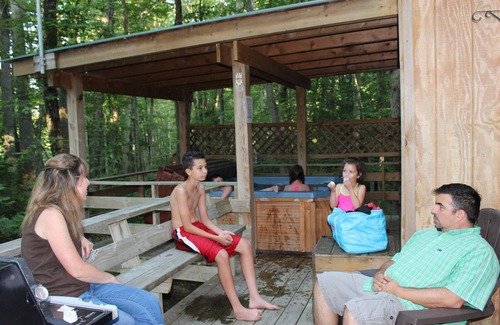This comfortable, deluxe, 2-story log cabin rental features include a TV, DVD palyer, Dish Network, Wi-fi, a deck with a private hot tub, gas grill, and central heating/cooling. The cabin is furnished with all bed linens and towels, all major kitchen appliances, cookware and utensils you will need.