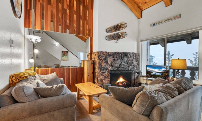 Enter by way of the building's spectacular wrap-around deck, taking in a panoramic mountain and valley view on your way. Inside, you'll be greeted by a light-filled living space with lofty ceilings, a wood-burning fireplace, and comfortable sofas where you can curl up to watch TV. The kitchen is compact but equipped with every essential, including a small dining table.
