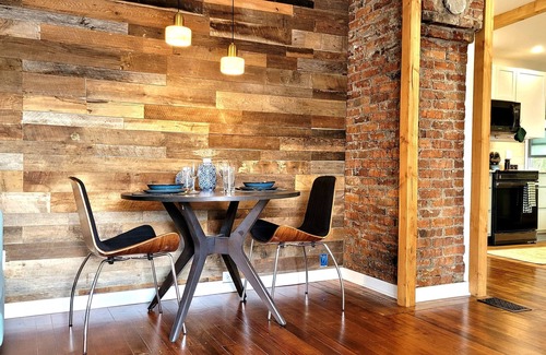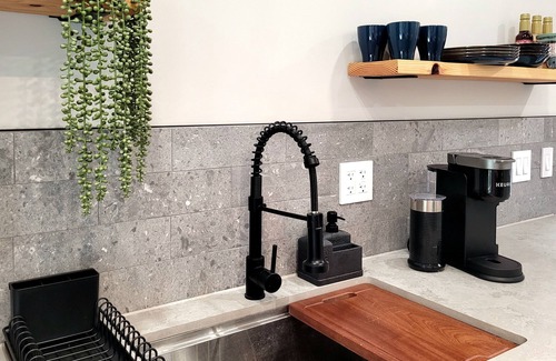 This newly renovated one-bedroom unit is accessible via a private entrance and is nestled on the second floor of our home. The living room offers Roku smart flat-screen TV, a comfortable couch, and a dining area that seats four. The fully-equipped kitchen includes all the essentials—utensils, plates, glassware, and a variety of cookware—plus a coffee maker with complimentary coffee and a small selection of flavored syrups. In the bedroom, you'll find a king-size bed with soft pillows and crisp cotton sheets and a walk-in closet with ample shelving and hangers for your belongings. The modern bathroom features a walk-in shower, heated floors, and complimentary shampoo, conditioner, and body wash.