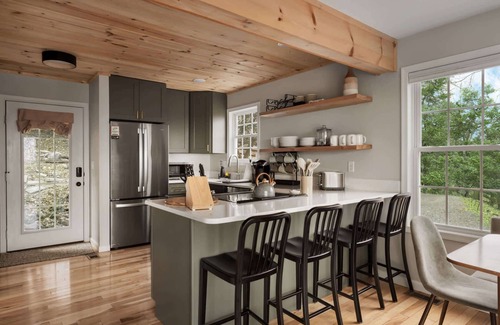 You’ll enjoy modern decor, wood beams, updated furniture, fireplace and plenty of seating for the entire gang. A fully stocked kitchen, perfect for preparing your favorite recipe. Seating in both the dining room and kitchen bar as well as on the deck and in the screened in porch - plenty of options for gathering with your group. Nature lovers will appreciate the access to Tuscarora Trail just a quarter mile away, with access to several hiking trails. After a long day of hiking and exploring, guests will also enjoy the expansive deck with plenty of seating, a fire pit and amazing views. You can even see the Milky Way from the deck or hot tub. Upstairs you'll find a cozy reading nook for relaxing with a good book or taking a work call. A great option for your family, friends or small group to get away for a little rejuvenation and relaxation!
