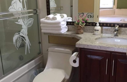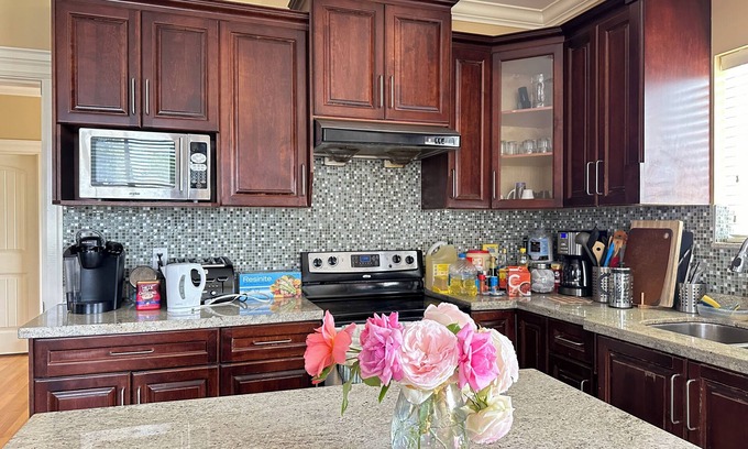 While you're here, you can enjoy all the comforts of home and more, including a full-sized refrigerator/freezer and an oven, as well as a stovetop and a dishwasher. Other amenities include laundry facilities, towels, an electric kettle, and kitchenware and utensils.
