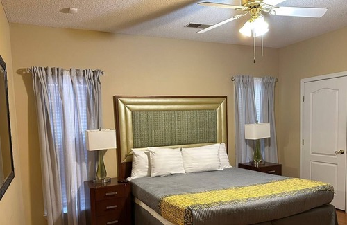 Sprawling Lake front Estate Home with Pool. Over 6000 square feet with 7 bedrooms plus bonus room. There are 9 king beds, 7 singles, and 3 Sofa bed. A basket ball court is also next to the Kitchen. This is living the highlife while in Elvis Presley Country. Fully Fenced and gated. Smart TV in all of the bedrooms. There are 3 dining area for larger Group. Very long Driveway for parking, leads your to this elegant home. Children's playground also is present.
