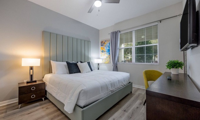 The spacious master bedroom features a plush king-sized bed, ensuring a restful night's sleep. With its own private bathroom, you can enjoy privacy and convenience, perfect for unwinding after a day of fun at the parks or exploring Orlando.