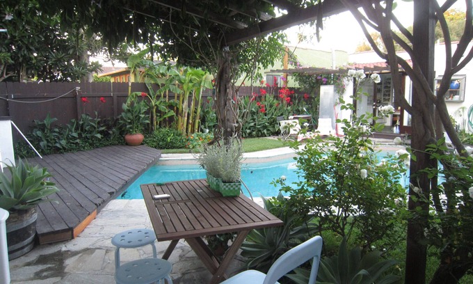 Share back yard and pool w/female architect owner and an occasional foreign student .This guesthouse is ideal for a quiet and cozy vacation for a couple or small family looking for a nice and peaceful area near the beach.