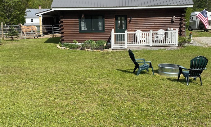 The log cabin at Trail End Ranch, which boasts the most comfortable beds, a well appointed kitchen/ living area. A perfect deck to enjoy the night sky, morning coffee, or afternoon relax time while watching the horses graze on our beautiful ranch pastures. Comfort and the outdoors, manicured lawns, Weber charcoal grill (charcoal/lighter fluid and grilling tools provided), Adirondack chairs and fire pit (kindling and wood provided). With spring skiing, their are resorts to choose just 6- 30 minutes, access to VAST Trails 1/2 mi away for the days adventures to unfold, snowmobiling at its best is right here! Lowell Lake State Park, restaurants nearby and nightlife at Magic Mountain ski area just 6 minute drive. Ranch life will be alive around you and you'll feel on your own and right at home. Welcome to the Log Cabin at Trail End Ranch!