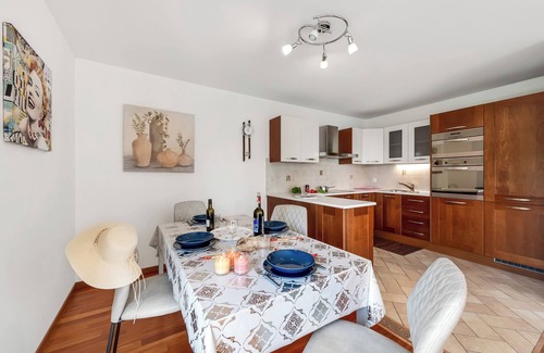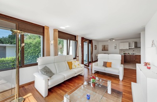 The apartment is on the second floor of a new development and is very well appointed with everything guests need for a comfortable holiday. The open-plan living room is flooded with light thanks to panoramic windows across two walls. The far wall of the room is a full glass door that looks out over the lake and the mountains beyond. The décor is contemporary with two white sofas and a glass coffee table. The kitchen is at the other end of the space and is very well-equipped with elegant fitted wooden units and a cooker hob, oven, microwave, dishwasher, fridge-freezer and coffee machine. The dining area is next to the kitchen, with a table for 4 people.