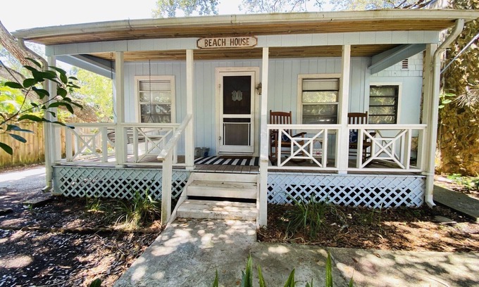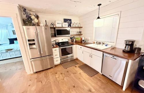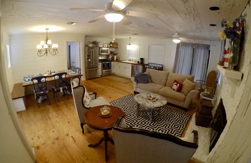 Fully remodeled, 2 bedroom 2 bath cottage with wood floors throughout and pecky cypress walls and ceilings. Outdoor living areas include 2 covered porches and a large open back deck. Large master bedroom with private bathroom, walk in closet, and a king size bed. Second bedroom features a queen size bed and private bathroom. There are two full size sofa beds located in the living room and family room. The dining room features a large, custom built-in banquette that seats up to 10 people. The new open floor plan kitchen overlooks the Family room, which includes a seating area surrounding the fireplace. Living room hosts comfortable seating around a 50” wall mounted flat screen TV. Outdoor shower.
