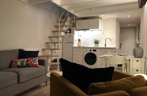 The duplex apartment consists of a hallway entrance leading to a bathroom, a fully equipped kitchen opening onto a living room. In the mezzanine a double bed and a bench / bed. Convertible sofa in the living room.