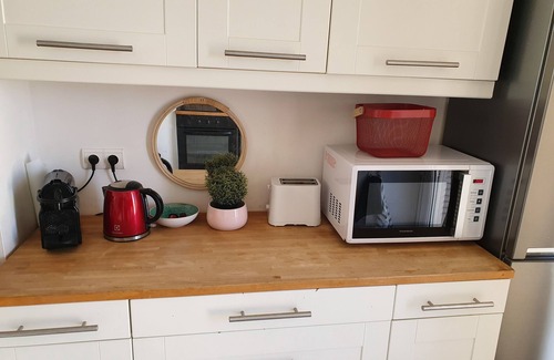 In the fully equipped kitchen (ceramic hob, fridge - freezer, oven, microwave, Nespresso coffee machine, kettle, toaster, dishwasher, washing machine), you will prepare breakfasts, meals or aperitifs and enjoy them either on the large balcony of 7m2 with open view of the sea, or on the small north-facing terrace for more freshness.