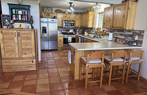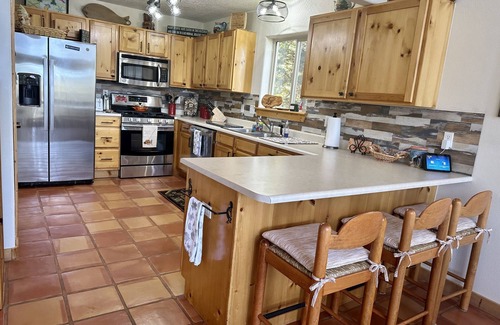 The seasons will draw you outside to enjoy the large deck. Deck seating for 10 will allow you and your family/friends to take in beautiful Angel Fire. A gas grill will allow you to cook up the fresh catch of the day. Guests are welcomed to a beautiful view, crisp air, expansive deck seating equipped with a propane fire pit. A fully equipped kitchen stocked with spices and essentials, wine bar with amenities, coffee bar with both a Cuisinart Single brew and Cuisinart full brew, and Gourmet Hot Cocoa Bar. The house also offers LG pedestal washer/dryer set with laundry detergent/dryer sheets. Closets and cabinets are stocked with extra set of bed linens and the both bathrooms have an abundance of towels. When booking our chalet, you just need to bring your personal items, relax, and enjoy your stay! The hardest thing you will do here is leave.