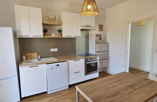 Entrance into fully-equipped kitchen (induction hob, electric oven, fridge-freezer combo, dishwasher, washing machine, microwave, coffee maker, kettle, crockery...)