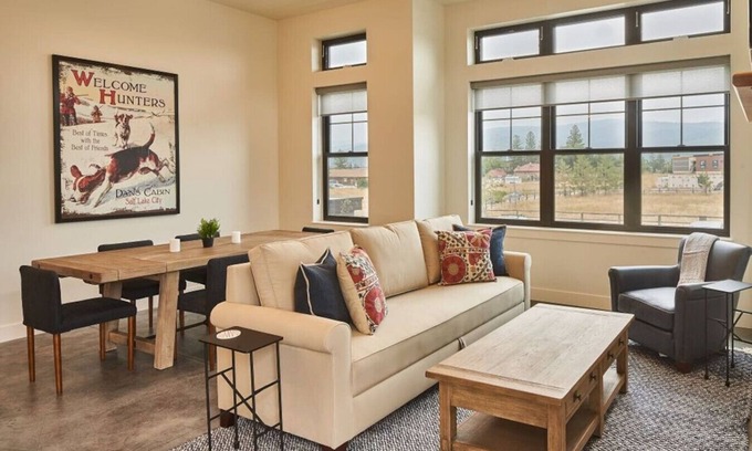 Fabulous light 2 bedroom apartment. Walking distance to restaurants and nightlife in Victor. Large and plentiful windows provide a light atmosphere and expansive mountain views. The unit comes with its own private patio. Complete range of new appliances and flat screen TV. Enjoy the cozy fireplace in the winter. Relax and watch the gorgeous sunsets. We also have a communal BBQ and fire pit area, as well as grassy knolls to enjoy outdoor picnics during long summer days.