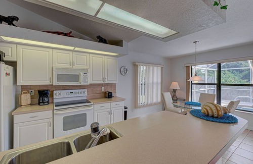 Glass sliders opening to your private screened pool area with a nice size lanai with outdoor dining and 4 loungers. Relax in the nice size pool with heat pump for cooler days.Two nice size guest bedrooms, one with Queen set and the other with 2 Twins. They share a bathroom with tub/shower combination. This bath also serves as a pool bath.