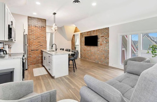 This home is perfect for large groups that also like the idea of having individual spaces. This Victorian beauty covers the 2nd & 3rd floors with 4 bd/ 3.5 bath, pull out couches, cozy seating, Wifi, work spaces & a fully equipped kitchens.