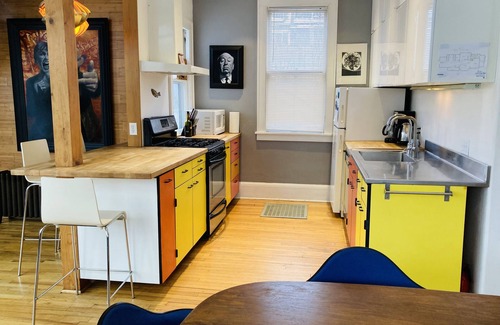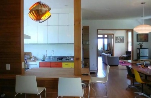A spacious, open layout with private rooms, pocket doors, leaded glass, original art, beautiful light and modern furnishings. We've hosted 1 or 2 guests, families, friends for small gatherings, and many business travelers.