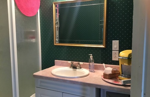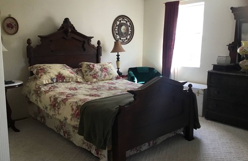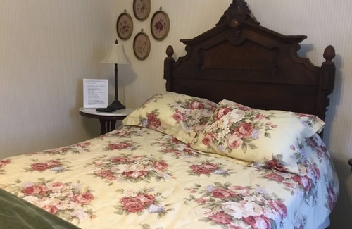 Sunny and cheerful room with yellow and white striped wallpaper reminiscent of rooms you find on Mackinac island stays. Queen size bed, Eastlake dresser and white wicker enhance the atmosphere. Private bath inside your room with shower, commode and sink. Wireless internet. Tv with Roku. 2 comfortable chairs to sit and relax. Make yourself at home.