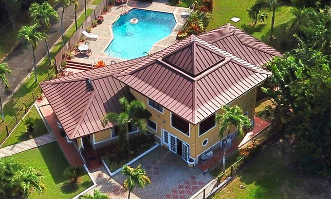 This Mt. Irvine Victorian Style, Spacious Bungalow villa boasts 4 inviting bedrooms, including 1 king bed and 3 queen beds. Each of the 4 bathrooms is equipped with a shower and toilet. As guests relax in this phenomenal property, they can enjoy the soothing ambiance of a well manicured garden, a large breathtaking swimming pool and modern amenities like AC, WiFi, washing machine and clothes dryer. We're happy to assist with any questions while you stay at our villa.