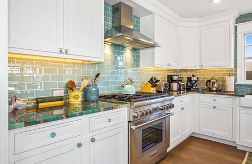 The gorgeous chef’s kitchen is equipped with high end appliances and a huge quartzite island with seating for six. Ample room for both dining and socializing with the chef. Dining area seats eight. Outside dining accommodates 10.