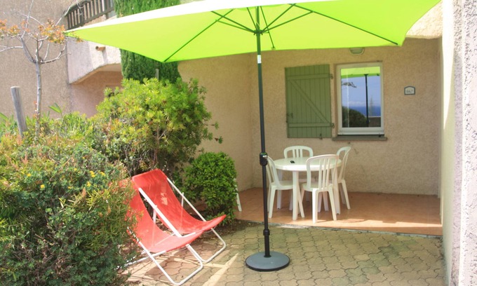 F2 36m2 in small residence on two levels, ground floor terrace with stunning sea view. 5 beds (a bedroom, a corner cabin and 2 beds in living room). equipped kitchen. separate toilet. Dishwasher. sheltered terrace.