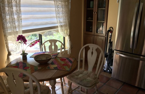 The guestroom has an ajoined patio to the kitchen area where there are plenty of birds and all kinds of wildlife. In the courtyard is a large fireplace and a pretty sweet little pizza oven.