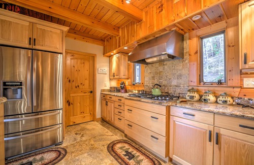 Just when you thought it couldn't get any better, it did. This Luxury Log Home at 3900 ft elevation has it all. Plenty of space for a large family to spread out or a couple to enjoy a romantic getaway. Sit in the new 6-person hot tub or by the outside fire pit and take in the amazing views. Luxurious Master suite and bath on the main floor. Screened in porches to unwind and relax. The gourmet kitchen with gas stove has everything you will need to prepare meals. The upper level of the house offers two spacious, private guest suites. There is also an extraordinary family/recreation room for endless entertainment with ping pong and large screen TV. The great room features a fireplace and expansive windows to take in the scenery. Automatic blinds to keep the sun out when needed. The large flat drive offers plenty of parking for all the guests who will want to stay. Just minutes above the Maggie Valley Country Club and Golf Course (open to the public). About 15 minutes to downtown Waynesville and 35 minutes to Asheville for venturing out. Laundry room in Mud room.