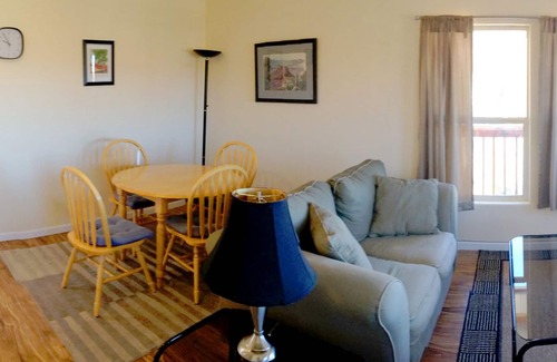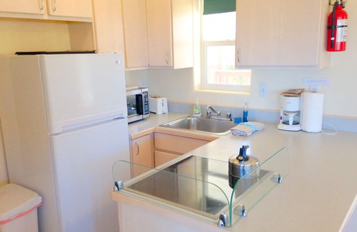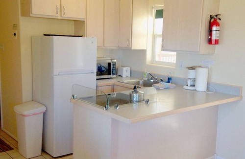 This private apartment’s wraparound deck sits well above it’s Moab hillside proximity with awesome views of the La Sal Mountains, the red rock cliffs and the nightly twinkling lights in the valley below. With one bedroom and bath, this comfortable accommodation is the perfect retreat for two people. - Intimate Quiet Setting at the top of Overlook Road - Spectacular Views of Moab Valley from Wrap-Around Deck and Large Windows - One Bedroom with King Bed and Bath with Shower (no tub) - Kitchenette with Refrigerator, Stove top (no oven), Microwave, Coffee Maker, and Toaster - Open living/dining/kitchen area - Wi-Fi Internet Access - Private Patio with Gas Barbecue - Secured Bike Storage Closet - Available Off-Season as a Monthly Rental - 1.5 Miles from Center of Town. Horse boarding available, sorry no dogs.
