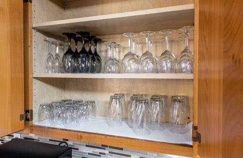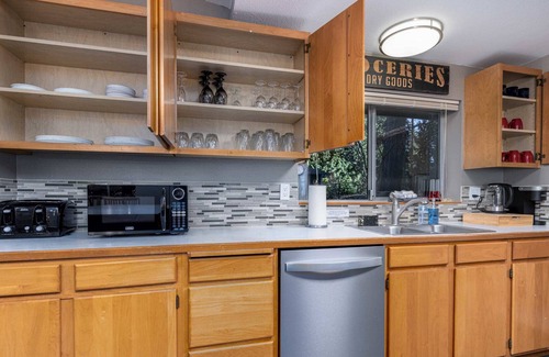 - Kitchen is stocked with kitchen appliances, cookware, silverware, servingware, keurig coffee & tea