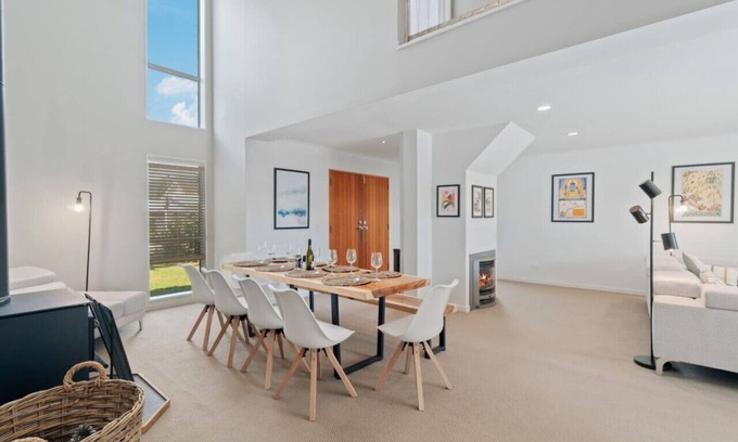 With Lake Wanaka & Wanaka township just a few minutes away, along with a variety of walking, biking tracks & trails on your doorstep, this modern, comfortable, spacious, bright home has it all. Bi-folding doors open onto a sheltered sunny deck with a grass yard & BBQ area where you can enjoy easy entertaining with effortless flow from indoors to outdoors. Views on Koru showcases open-plan living with a dining area & cozy wood burner, a comfortable lounge with Smart TV, large modern kitchen & four spacious bedrooms, 2 upstairs and 2 downstairs (with portable heaters), main bathroom, powder room, and ensuite off the master bedroom. The well-equipped kitchen has everything you’ll need to prepare delicious meals & you can directly pass food to your outdoor guests via the bifold kitchen window. There`s a butler`s pantry, dishwasher, four burner gas cooktop, oven, entertainers fridge/freezer, and of course a Nespresso coffee machine for your morning coffee hit. Views on Koru comfortably accommodates eight guests. The house configuration is ideal for two small families or a group of friends on an adventure away. There is car parking available on the premises for up to 2 cars.