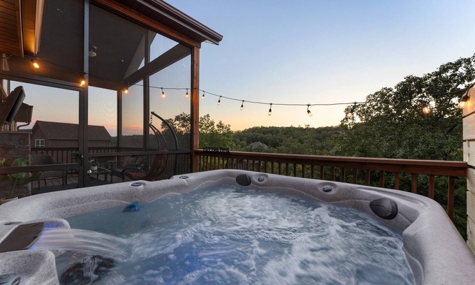 Soak in the luxury of the PRIVATE HOT TUB while taking in the SUNSET over the Ozark Mountains. Gather around the OUTDOOR FIREPLACE and TV on the screened-in deck for a movie under the stars.