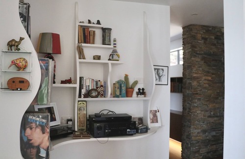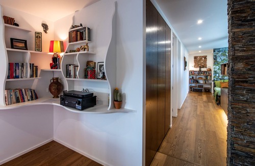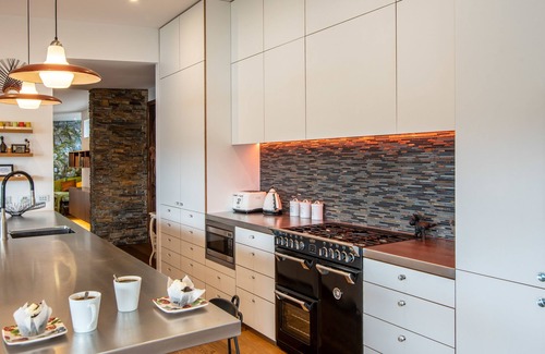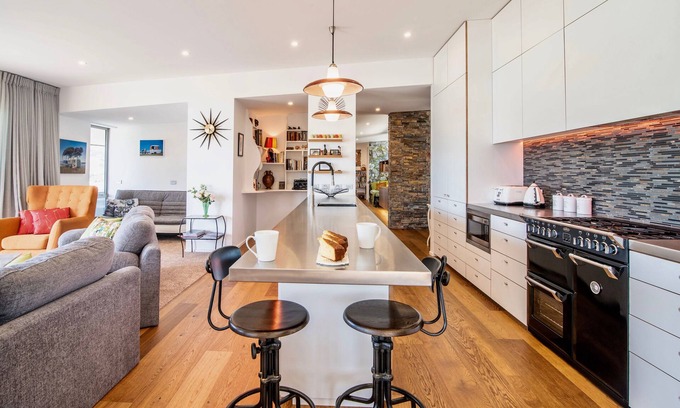 An elegant and artistic interior from the schist rock feature wall, the hand-painted mural surrounding the reading nook, seamless indoor/outdoor flow, and finally to the custom laser-cut steel patterned wall down the western side of the home. Taka Retreat is an indulgent escape, where you'll be waking up to the sound of native birds, enjoying breakfast with a view and at the end of the day, sipping a long cool drink on the deck overlooking the water. Stay cool under the air-conditioning or enjoy the fresh air out of the sun under the large, sheltered sundeck fitted with outdoor speakers.