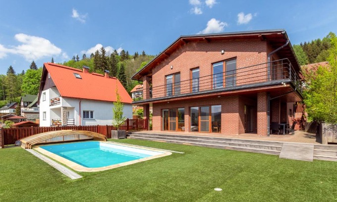 Offering a garden, Vila Sluneční stráň offers accommodations in Svoboda nad Úpou. This property offers a private pool, free Wifi, and free private parking. The villa provides an indoor pool, sauna, and a shared kitchen. Opening onto a balcony with pool views, the spacious villa consists of 4 bedrooms. Providing a terrace with mountain views, this villa also offers a cable flat-screen TV, a well-equipped kitchen with a dishwasher, an oven, and a microwave, as well as 4 bathrooms with a bath and a hair dryer. There's also a seating area and a fireplace. Guests can make the most of the warm weather with the property's barbecue facilities. You can play table tennis and darts at the villa, and the area is popular for hiking. Skiing and cycling can be enjoyed nearby, while a ski equipment rental service, ski-to-door access and a ski pass sales point, are also available on-site. Bus Stop Strážné is 17 miles from Vila Sluneční stráň, while The Grandmother's Valley is 21 miles away. Pardubice Airport is 52 miles from the property.