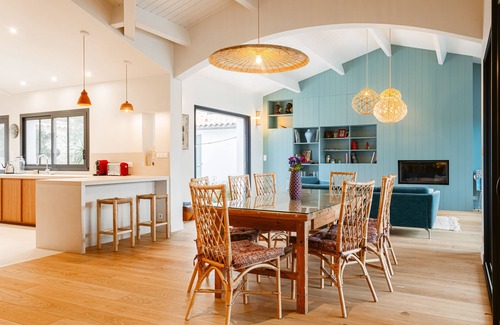 Superb luxury villa in the heart of Sainte Marie de Ré in a small dirt street (a raise) lined with hollyhocks. The Villa is perfect for two families with one side of the house 2 bedrooms and the other two bedrooms. The 4 are en-suite. The living room (kitchen, dining room, living room) of over 100m2 opens on one side on the heated 10x4m pool and garden, the other on a large patio.