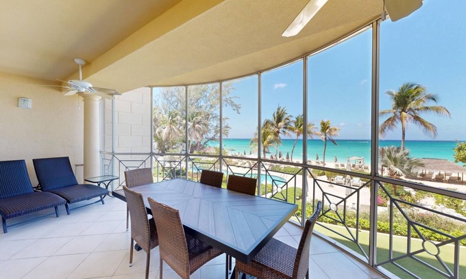 Three king bedrooms with private en suite bathrooms, oceanfront, fully equipped villa. Enjoy white powder sand beach located right in the middle of Seven Mile Beach. Flat screen televisions in all bedrooms. Bathrooms supplied with hairdryers, soap, shampoo and conditioner. Master bedroom on ocean side of villa. Kitchen fully equipped. Housekeeping service available daily (except Sundays, Good Friday, Christmas day, New Year’s day), housekeeping supply dish detergent, paper towels, bathroom tissue and fresh towels. Dining table and lounging chairs on screened-in porch facing the ocean. Beautiful dining and lounging areas and four BBQ grills near the pool and beach, all with easy access via elevators or stairs. Fully equipped workout facility. Plenty of shade huts, umbrellas and lounge chairs available on the beach. We supply beach towels. Electrical outlets same as USA and CANADA. Tap water safe to drink throughout the island. Many restaurants deliver, just add BENTO app to your cell phone.