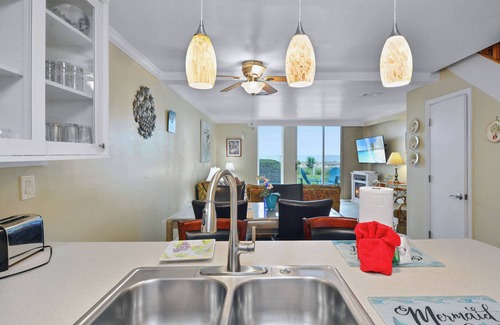 Terrific 2-bedroom, 1 1/2 bath oceanfront condo with great views of the ocean. Villa 131 has an electric fireplace in the living room and a 55-inch smart TV. This villa is warm and inviting, featuring a ground-floor patio with an ocean view, as well as a master bedroom balcony overlooking the ocean. The master bedroom has a queen bed, and the second bedroom comfortably sleeps up to four with a twin-over-queen bunk bed and a convenient twin trundle—ideal for kids or extra guests. Beach access is not far away. Swimming pool, laundry, fitness center, bike rentals, restaurant & gift shop on site.