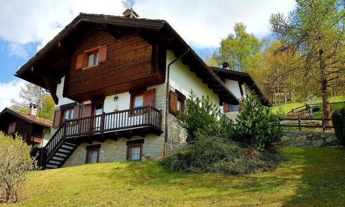 Nestled in the Pila basin, Chalet Grande Cerise offers a breathtaking view over the entire central valley, among which the countless four thousand of the Aosta Valley stand out. Located in a strategic position, just 13 km from Aosta, about 3 km from the ski resorts of Pila and less than 900 meters from the intermediate station of the gondola that connects the regional capital with the ski resort. The Chalet is on 3 levels, ground floor with large and bright living room, fully equipped kitchen and lounge. First floor in which stands a beautiful double bedroom and a bedroom with two single beds all furnished in rustic style, complete the floor a bathroom with shower and a beautiful and large balcony overlooking the garden. Third and last level, the basement floor in which there is a large double bedroom which is very bright and in the hallway a nice sofa bed. A bathroom with tub completes the floor. The Chalet is free on all 4 sides and is surrounded by a fantastic and luxuriant garden for the exclusive use of approximately 200sqm, with a brick barbecue for the best barbecues! In the middle of winter it is possible to reach the house on skis!