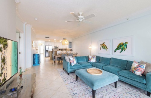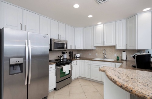 Ground floor. Three bedroom, three bathroom, oceanfront, fully equipped light and airy villa. Two king and a one set of twin bedrooms, both with adjoining private bathrooms. Bedrooms all have room darkening shades and smart TVs. Bathrooms supplied with hairdryers, soap, shampoo and conditioner. Master bedroom is on the ocean side of villa. The kitchen comes fully equipped for home cooking. Housekeeping service available daily (except Sundays, Good Friday, Christmas day, New Year’s day), on these days supplied with dish detergent, paper towels, bathroom tissue and fresh bath and beach towels. Enjoy our white powder sand beach located right in the heart of Seven Mile Beach. There is a dining table and lounging chairs on villa 3's screened-in porch facing the ocean. Beautiful dining and lounging areas and four BBQ grills by the pool and beach, all with easy access via your screened patio door. Our gym is a fully equipped workout facility. Plenty of shade huts, umbrellas and lounge chairs available on the beach. Free WIFI in villa, beach and gym. Electrical outlets same as USA and CANADA. Tap water safe to drink throughout the island. Many restaurants deliver just add BENTO app to your cell phone. .