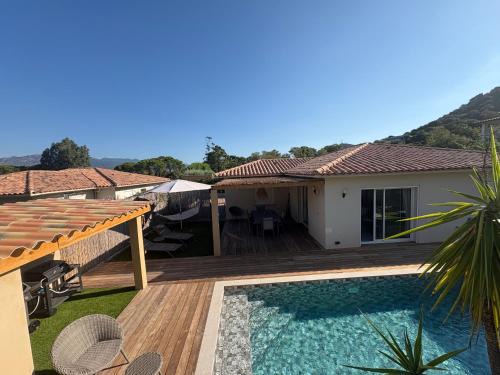 Villa A Casa Leo baie Porto Vecchio piscine privée chauffée à 5 min des plages de Palombaggia Santa Giulia is located in Porto-Vecchio, just 4.4 miles from Porto Vecchio Port and 17 miles from Bonifacio Port. This property offers access to a terrace, table tennis, free private parking, and free Wifi. In their free time, guests at the villa can opt for a relaxing dip in the outdoor swimming pool, a drink at the bar, or a stroll in the garden. The air-conditioned villa consists of 3 bedrooms, a living room, a fully equipped kitchen with a dishwasher and a coffee machine, and 2 bathrooms with a shower and a hair dryer. Guests can enjoy a meal on an outdoor dining area while overlooking the mountain views. For added privacy, the accommodation features a private entrance. For those times when you'd rather not eat out, you can cook on the barbecue. Former Chapel of the Trinity is 19 miles from the villa, while The Lion of Roccapina is 28 miles from the property. Figari-Sud Corse Airport is 14 miles away.