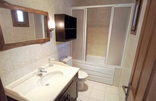 From entrance hall - steps to lower level, double bedroom and sofabed, twin bedroom, bathroom with bath/shower/wc. Exit to ground floor terrace and private garden.