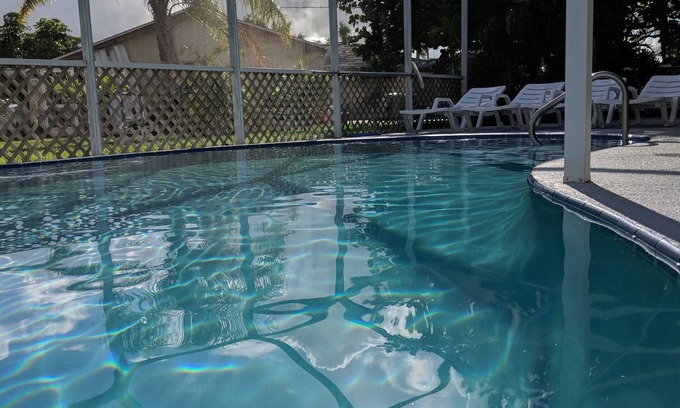 A perfect vacation retreat, this beautiful fully renovated 1500 sqf 2 car garage, 3 bedrooms, 2 bathrooms house situated NE of Fort Myers, 20 min. from the airport, 40-45 min. to the beaches is just waiting for you! Enjoy this quiet, safe, well established neighborhood, come to Villa Aurora and take advantage of our private, solar panels heated swimming pool and screened lanai, sit down, relax and admire the view of Lake Camille.