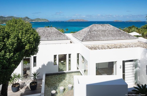 The view on the ocean and Lorient Bay with plenty of different blues is splendid. Its elegant decoration is making this villa a luxury one.