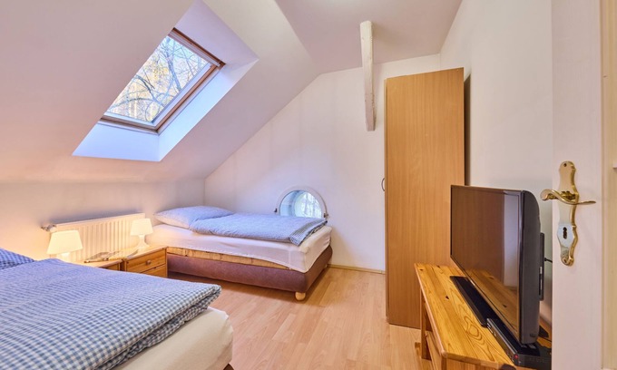 2-room apartment on 2nd floor. Bright, beautiful furnishings: 1 room with 2 beds. Kitchen (2 hot plates, microwave, electric coffee machine) with TV. Shower/WC. Facilities: Internet (WiFi, free). Please note: suitable for families. TV only CS.