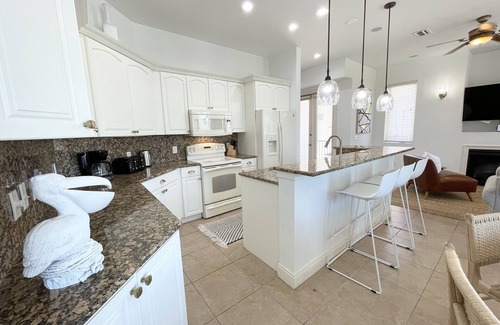 Our 4-bd, 4-bth house w/ in home elevator in Laguna Beach on the calm west end of Panama City Beach, FL. Close to the scenic 30A district, located on a quiet St, just steps from sugar-white sand beaches! 2 tw bunk bds, 1 full bd w/ on Suite bth & king bd w/ on Suite bth on the 1st flr. The 2nd level has open kitchen, dining, livingrm w/ 55” TV, fireplace, bonus Den w/ 50” TV. Full laundry room complete the 2nd level. The owner suite and on suite bth on the top floor. BBQ on livingrm balcony.