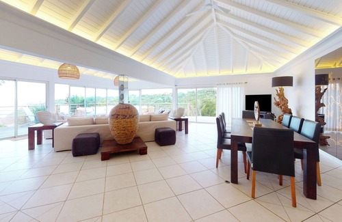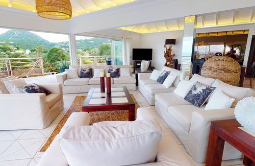 Built on two levels, the luxury rental CAPTAIN COOK has a large air-conditioned living room which opens onto the outside. It is furnished with sofas, armchairs and coffee table in utmost comfort. The view over the ocean and the surrounding hills is spectacular through the windows surrounding the living space. The indoor dining room can accommodate up to eight guests around a beautiful wooden table and lovely decorative objects, close to the well-equipped kitchen. The comfortable bar welcomes you and your guests at breakfast time or for talking sessions over a coffee.