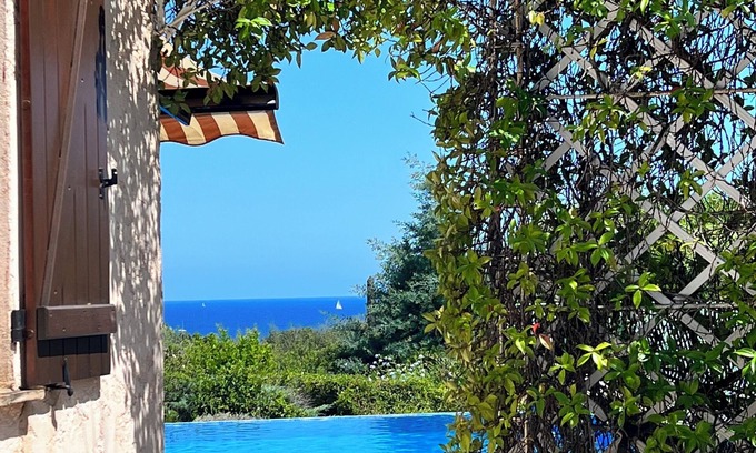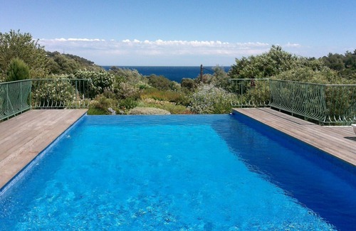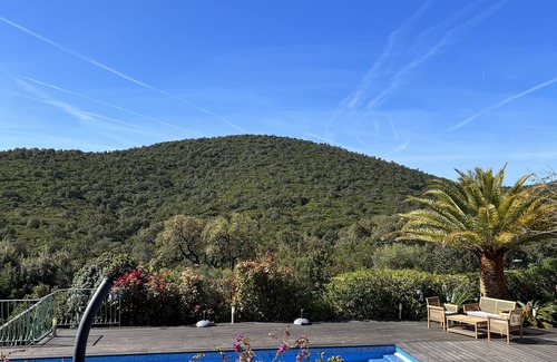 Massive swimming pool! 13m x 5m, deep enough to dive in. With a teak wood deck. The house sleeps 11 in 5 bedroom villa with 2 bathrooms, and 2 separate toilets, located close to beach and looking out onto undeveloped nature reserve and sea view. Less than 5 minutes easy walk to the idyllic Bonporteau beach, with sandy beach and nearby rocky coves for snorkeling fun. A cycle track starts almost outside the door allowing you to cycle on the former train line that run along the coast allowing easy riding for many miles. Well located near to the port, shops and beach - all that you need is readily to hand. Explore the region with St Tropez 15km away and the nature reserve on the islands of Port Cros and Porquerolles accessible directly by ferry from the port of Cavalaire. Looking over the undeveloped nature reserve and down to the Azur sea. Enjoy a relaxing provençal holiday any time of the year. The garden is mature with many flowering plants giving a spectacular display in the spring and provençal scents in the summer.