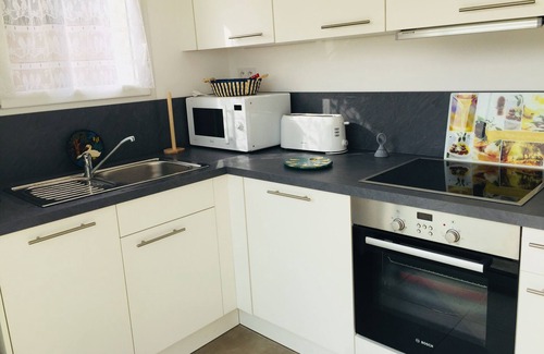 2 bedrooms with single beds, 1 bathroom with walk-in shower, separate toilet, living-dining room with sofa, fitted and equipped kitchen (oven, washing machine, dishwasher, microwave, refrigerator large capacity ).