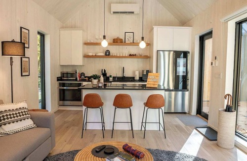 The modern, yet unique design of this tiny villa space allows it to not feel “tiny” and the full kitchen takes advantage of this layout. High end appliances, countertops and cabinets line the kitchen while the elevated dining bar allows you to enjoy any meal!