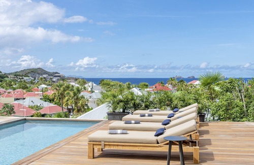This villa faces the bay with a view of the ocean. You can easily walk to the beach of Flamands.