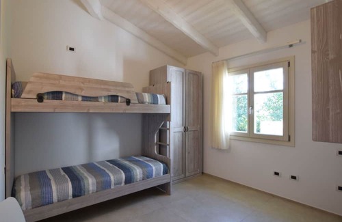 On the same floor are the three bedrooms, two of which have a double bed and one equipped with two bunk beds, and two bathrooms, both with showers.