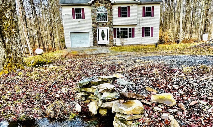 This newly renovated beautiful Pocono home with porch is perfect for all seasons & occasions in Arrowhead Lake amenity filled gated community. It is situated on a gorgeous wooded lot right on the edge of the state game lands! With a nearby heated pool in a secure gated community. Washer, dryer, dish washer, TV, and more! central air.